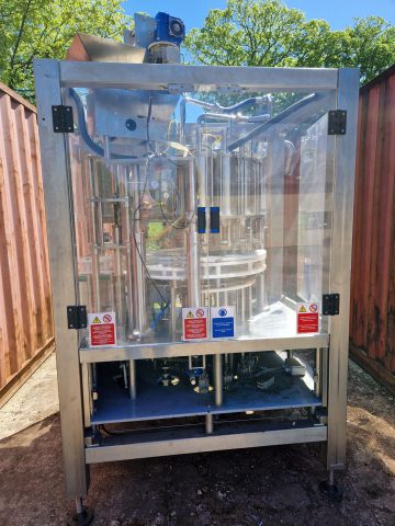 I6 head bottle filling machine, for rinsing, filling and capping bottles. Suitable for beer, wine or soft drinks, processes 50 bottler per hour. Fits crown caps of 26-29mm. Machine has 5 rinsing nozzles and 5 filling turrets.